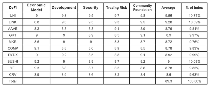 According to the 5 weighting factors of the fundamental weighted method, Matrix DeFi Index fund computes the fundamental weights of different kinds of component tokens as below: