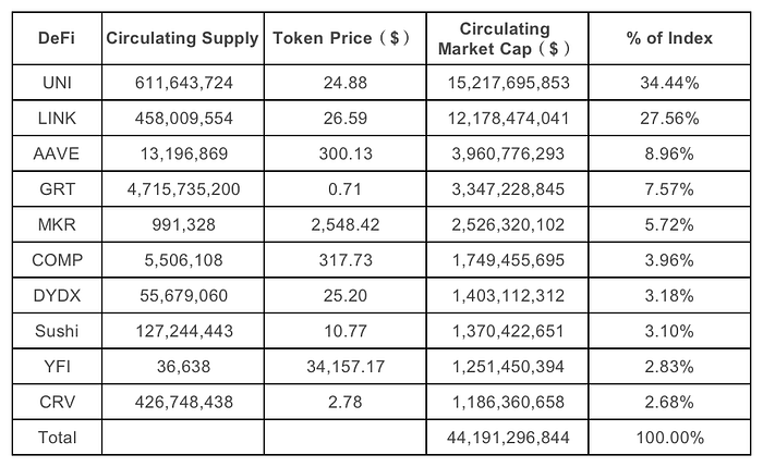 According to Market Capitalization Weighting, Matrix DeFI Index(MDI) computes different component token weight as below: