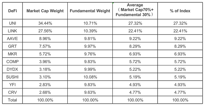 Taking Matrix DeFI Index (MDI) funds as an example, based on fundamental weighting and market value weighting, the final weighting ratio of each component token is as shown in the following table: